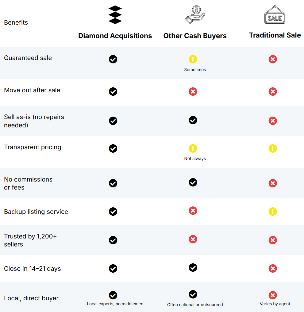 Agents will list your house on the MLS and charge you commissions and fees if they are able to find you a buyer. This process can take months, especially in this market. Diamond Acquisitions Home Solutions is a professional home buyer, meaning we pay cash instead of listing your home, and we close whenever you prefer!